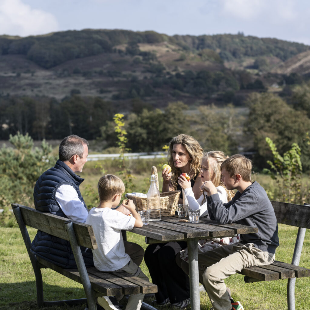 Hvis du bevæger dig op til plateauet ved indgangen til Thingbæk Kalkminer, finder du borde, bænke og en fantastisk udsigt. Nyd den sammen med din medbragte mad.